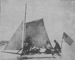 Fourteen feet long, the wagon was eight feet across in front and narrower in the rear. Rigged like a sloop, it had a 15‑foot‑tall mast to which were attached a fore‑and‑aft rigged mainsail and jib.