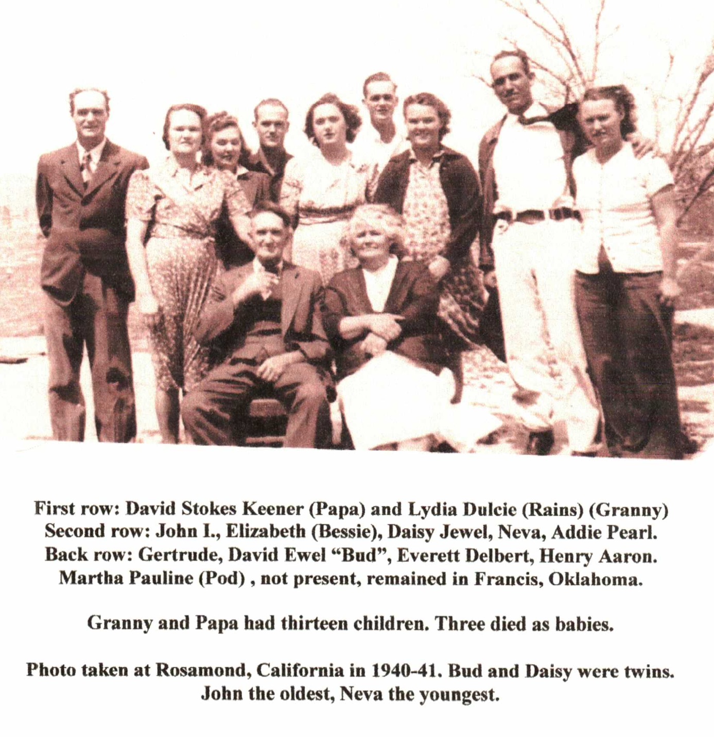 The Keener children of David Stokes (Papa) born 9-9-1879 and Lydia Dulcie (Granny) born 11-2-1881 had a habit of sticking together. Here they came, except Martha Pauline (Pod) Keener Jones (born 2-27-1904. Her husband Clemency Clay (Clem) Jones had a good job with the rail road and was not moving. Papa did not have a car so he traded 4 hogs for his brother-in-law's old truck. They traveled in a caravan. The single children went with Granny and Papa. The rest drove their own cars. Papa said he had 100 flats before he hit California in that old truck. In those days, we patched the inner tubes and put boots inside the tire to cover the blown out hole in the tire. Uncle Gordon lived in a big house. A block or so behind the row of business on the main road. He was the boss, you know.